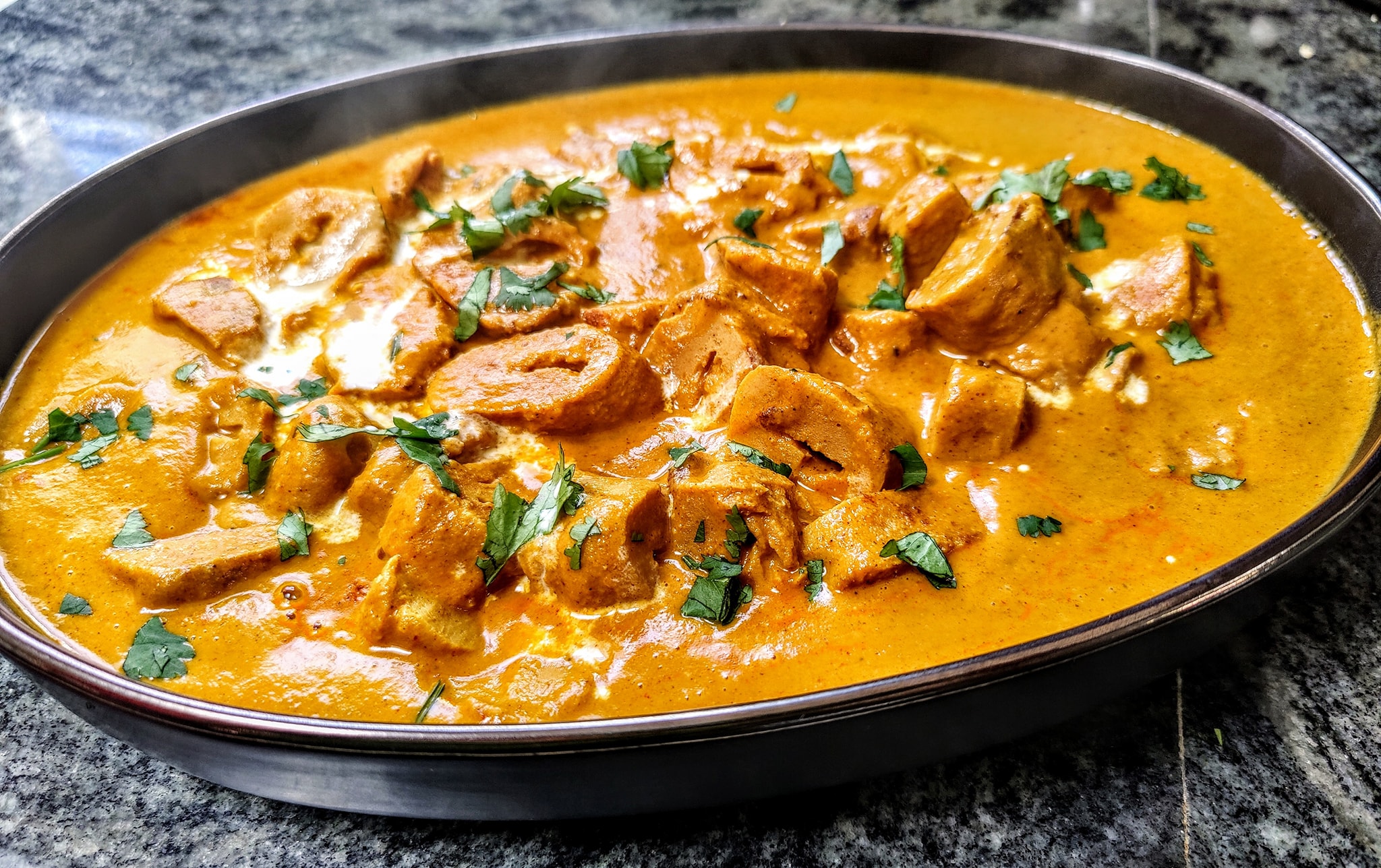 Boneless Tandoori Chicken Tikka cooked in butter, tomato and creamy rich sauce