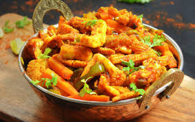 Cubes of chicken cooked with peppers, onion, stir fried with coriander seeds and tangy sauce