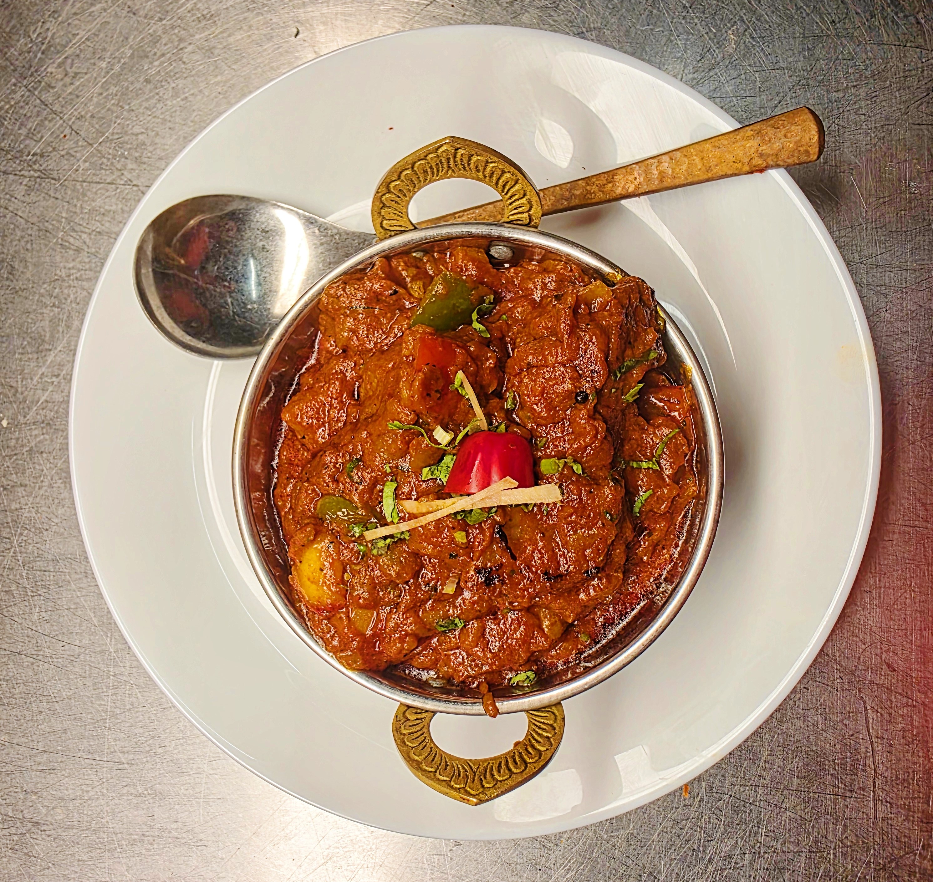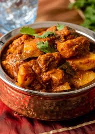 Boneless lamb meat cokked in pickling hot goan spices and a touch of vinegar and potatoes
