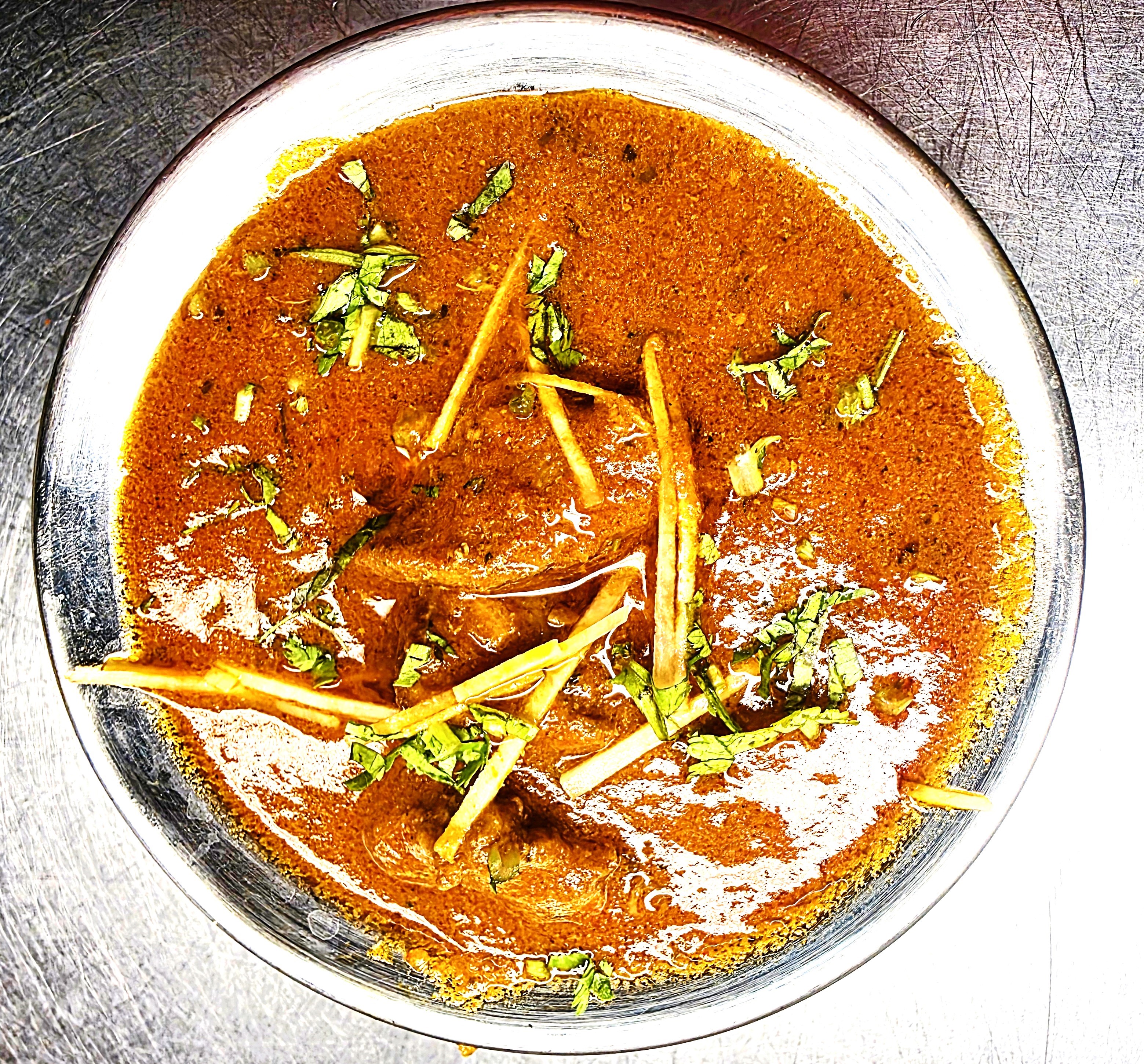 Boneless lamb meat cooked in onion tomato sauce with turmeric and fresh herbs