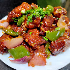 Boneless chicken cooked with soya sauce, chilly sauce and peppers and onion