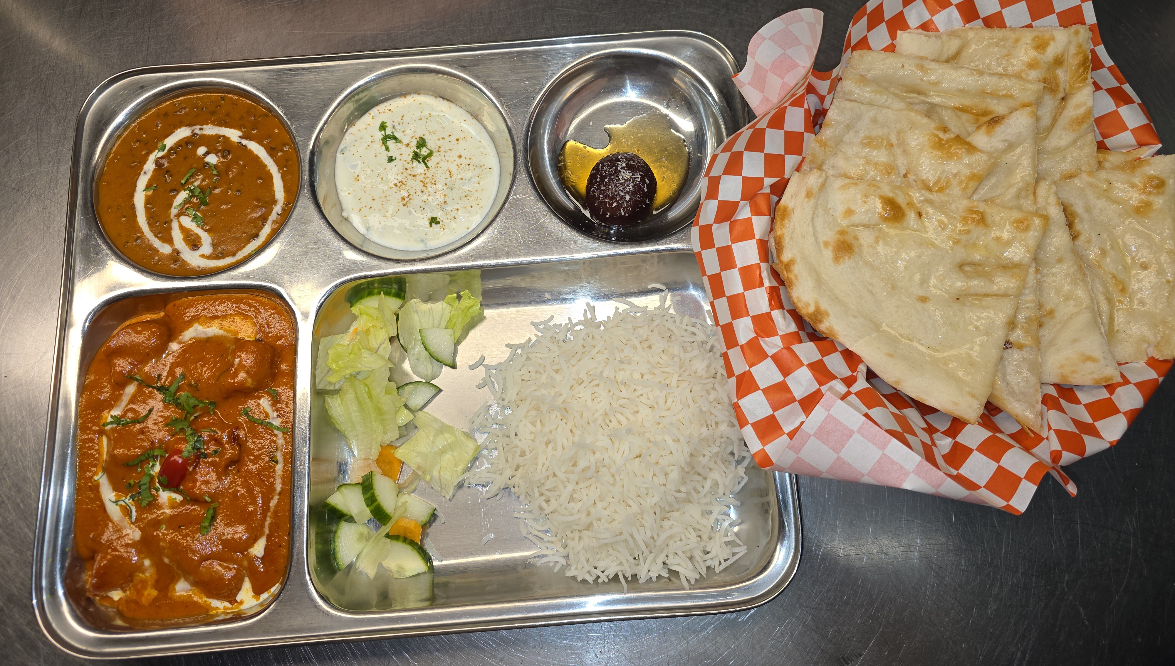 Boneless tandoori chicken tikka cooked in butter, tomato and creamy sauce, dal, rice, naan, dessert, raita and salad