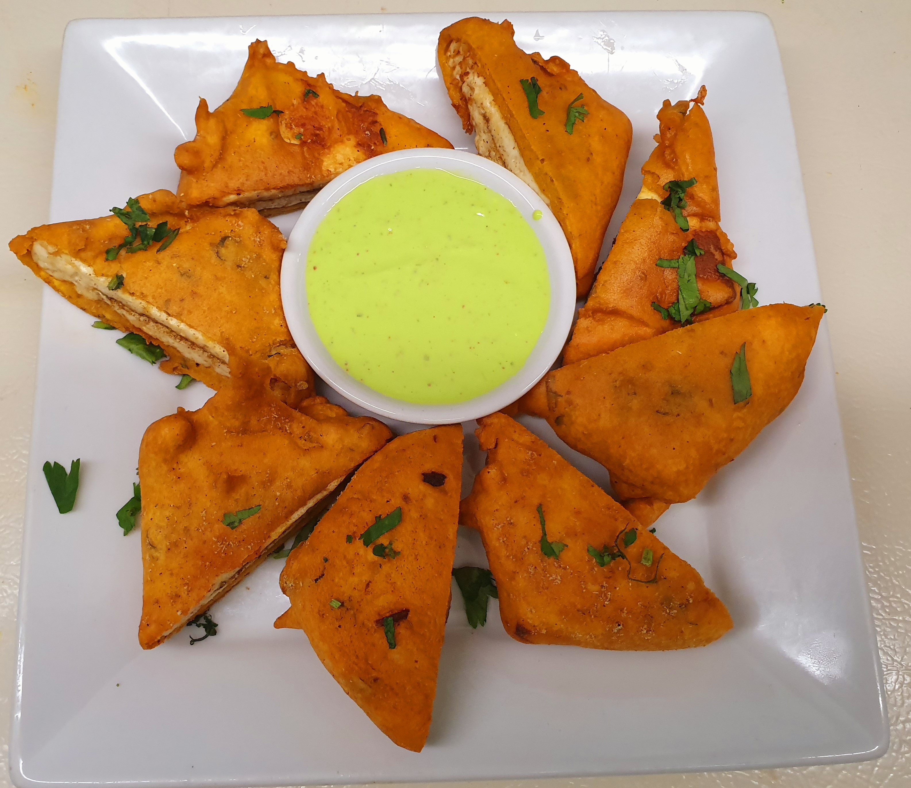 Homemade cheese in gram flour batter & deep fried serve with mint sauce
