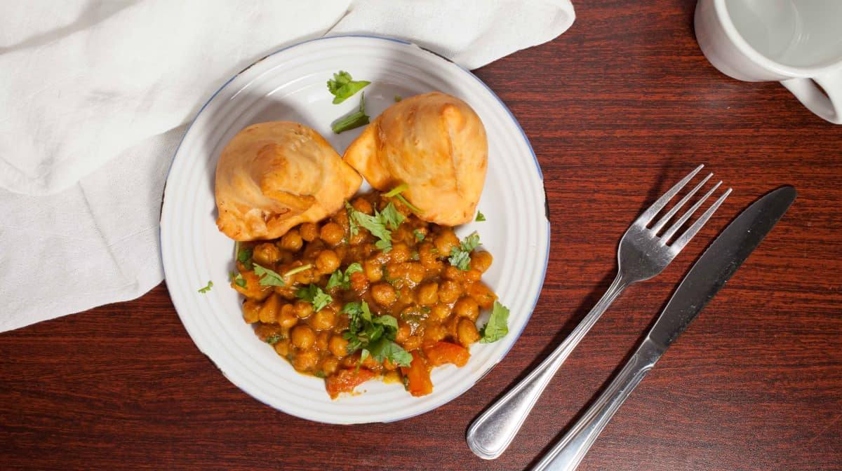 Pastries stuffed with spiced potatoes and green peas served with cheakpeas curry on the side.