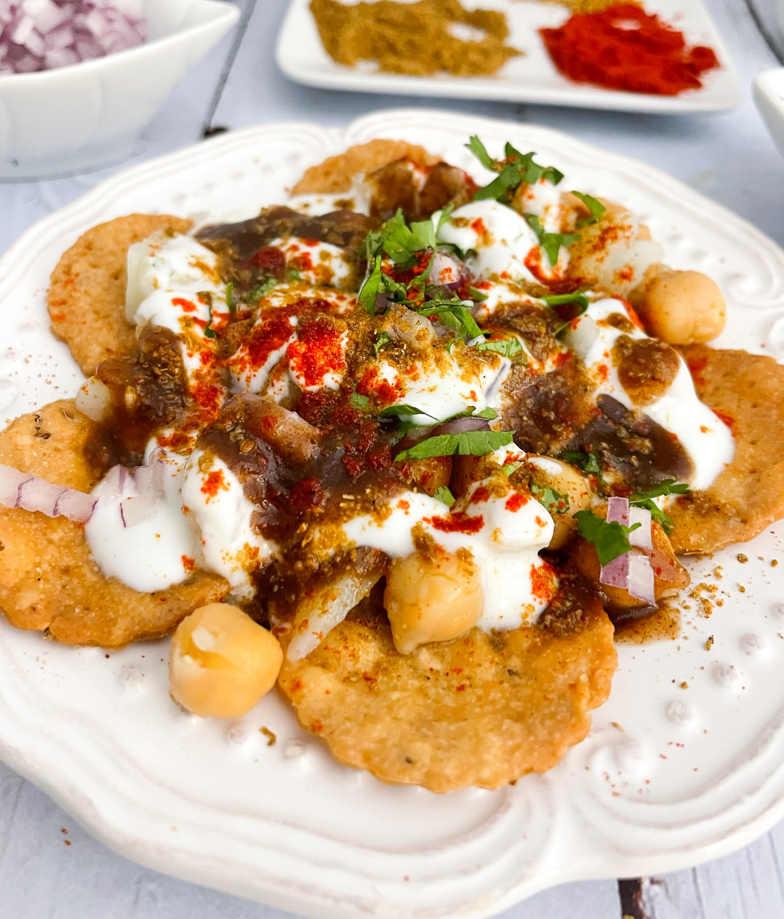 Homemade crispy fried dough wafers serve with chicpeas, potatoes, mint sauce, tanrind sauce and yogurt
