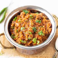 Baked mashed eggplant cooked with fresh tomatoes, onion and green peas with dal, rice, naan, dessert, raita and salad
