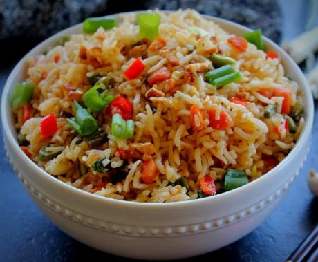 Basmati rice saute with soya sauce, boneless checken and vegetables