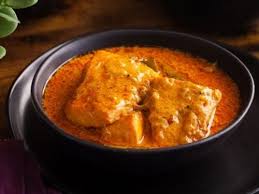 boneless chunks of meat cooked in thick cream sauce and touch with coconut powder and dal, rice, naan, dessert, raita and salad