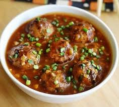 Veg balls cooked with soya sauce, tomato ketchup flavoured garlic sauce with gravy