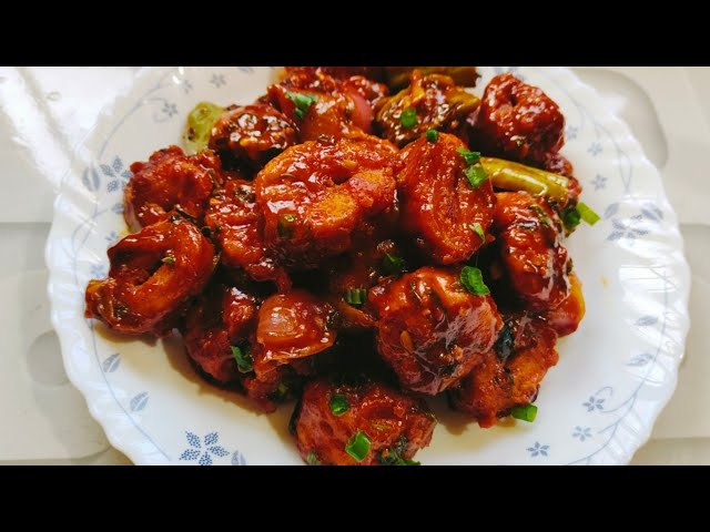 Boneless chicken cooked with soya sauce, chilly sauce and peppers and onion