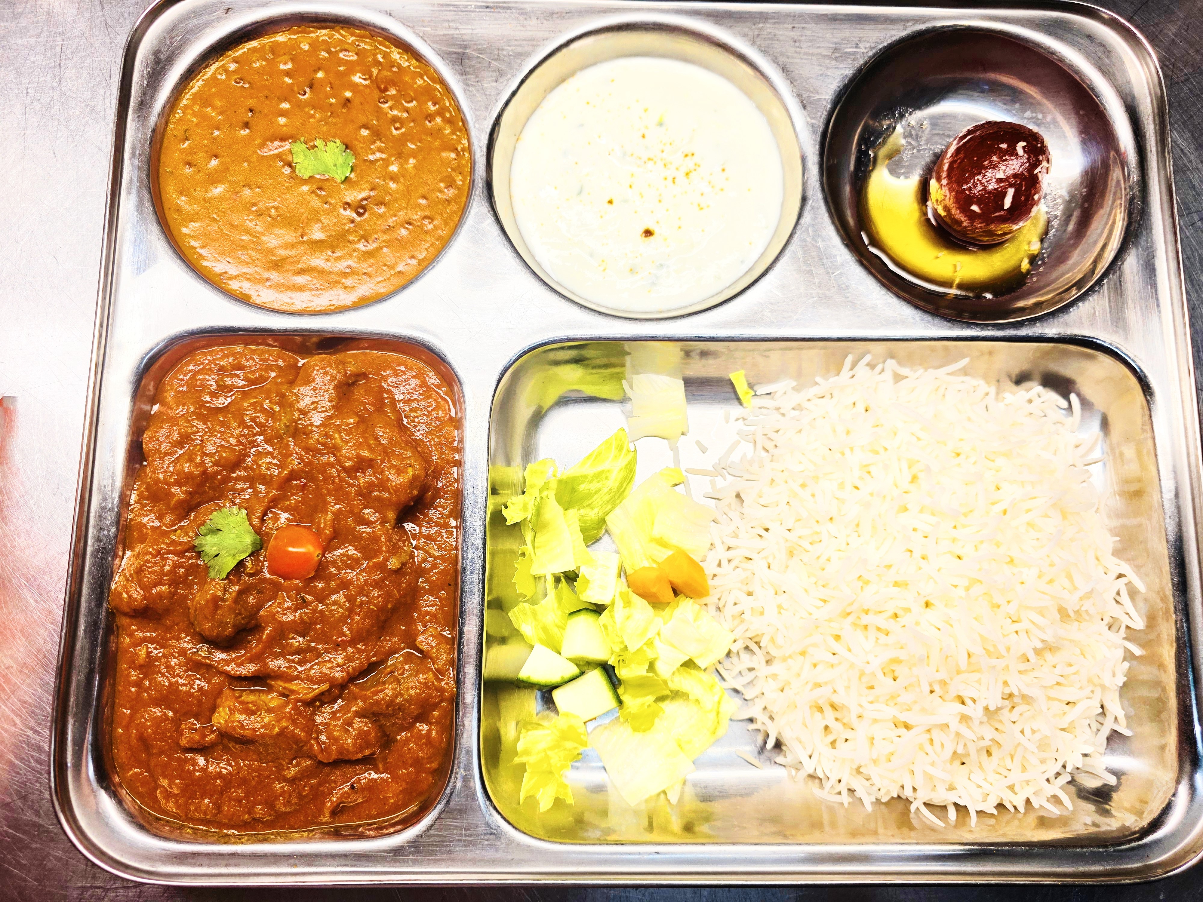 Boneless lamb meat cooked in onion tomato sauce with turmeric, fresh herbs and dal, rice, naan, dessert, raita and salad