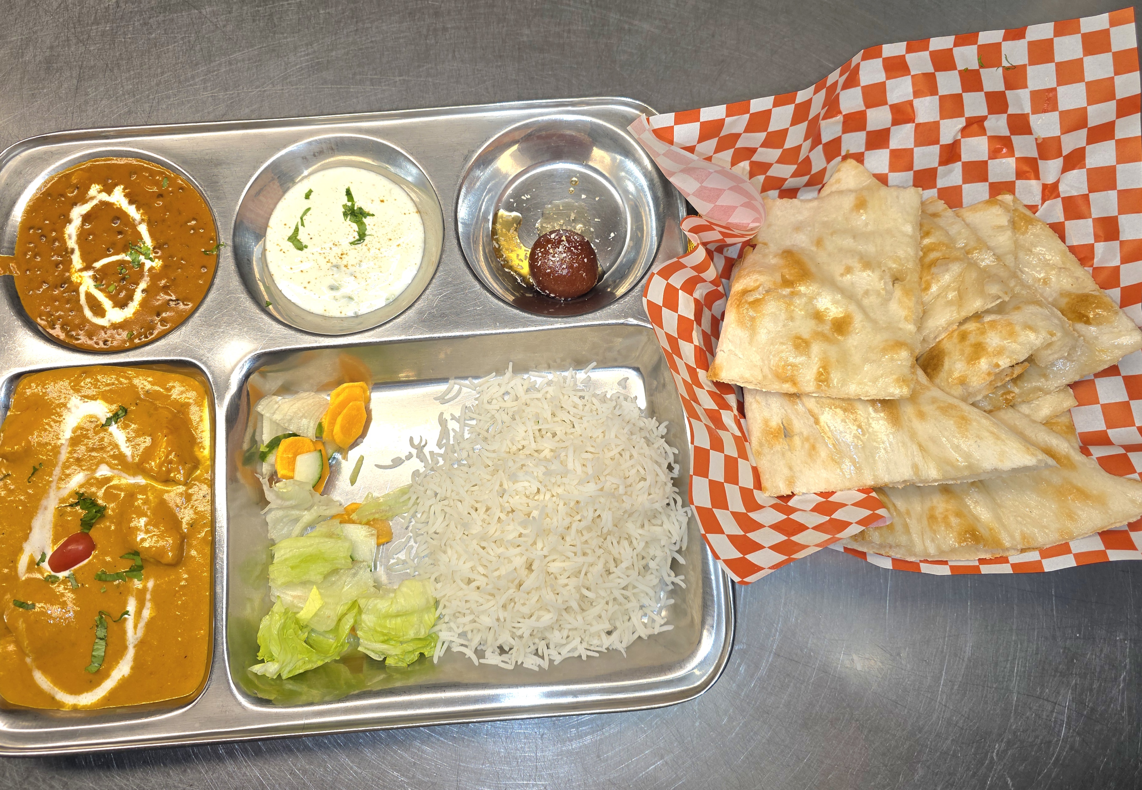 Boneless tandoori chicken tikka cooked in butter, tomato and creamy sauce, dal, rice, naan, dessert, raita and salad