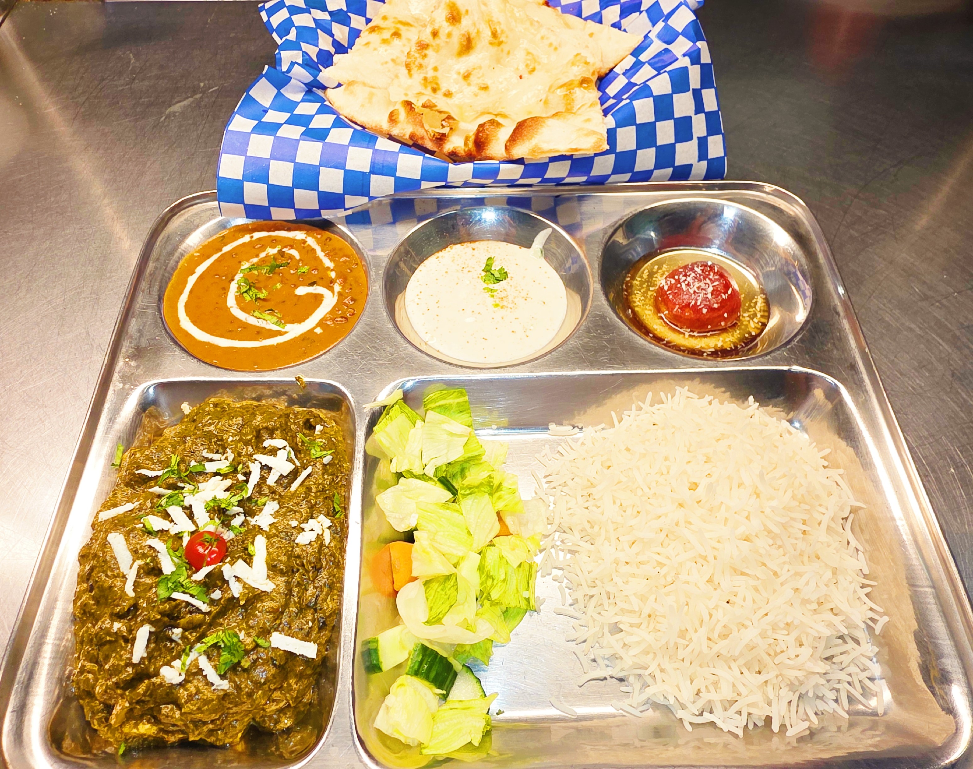 pureed baby spinach braised with garlic and cooked with boneless cubes of chicken and dal, rice, naan, dessert, raita and salad